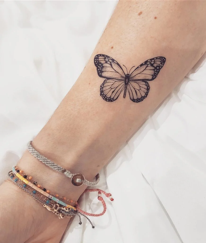This tattoo features a fine line monarch butterfly placed delicately on the forearm, keeping the design minimal and light.