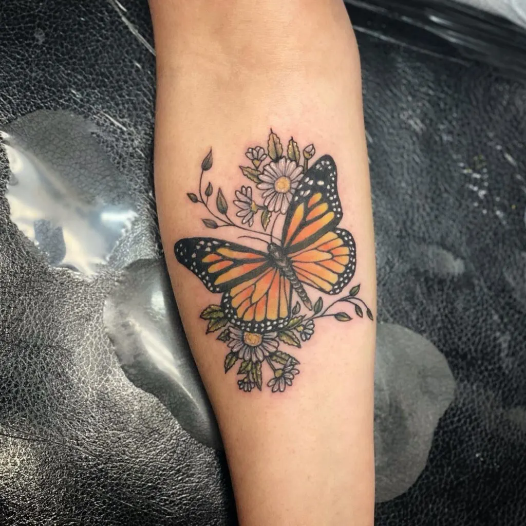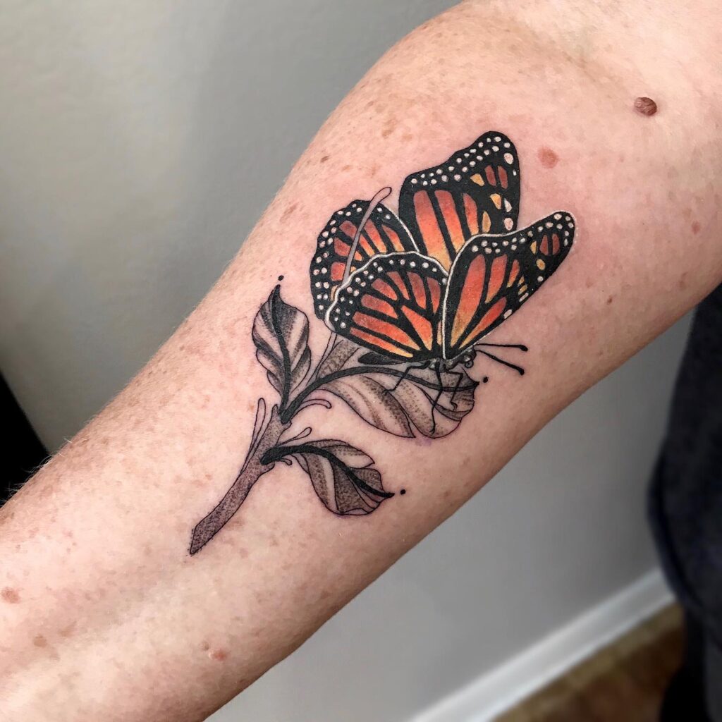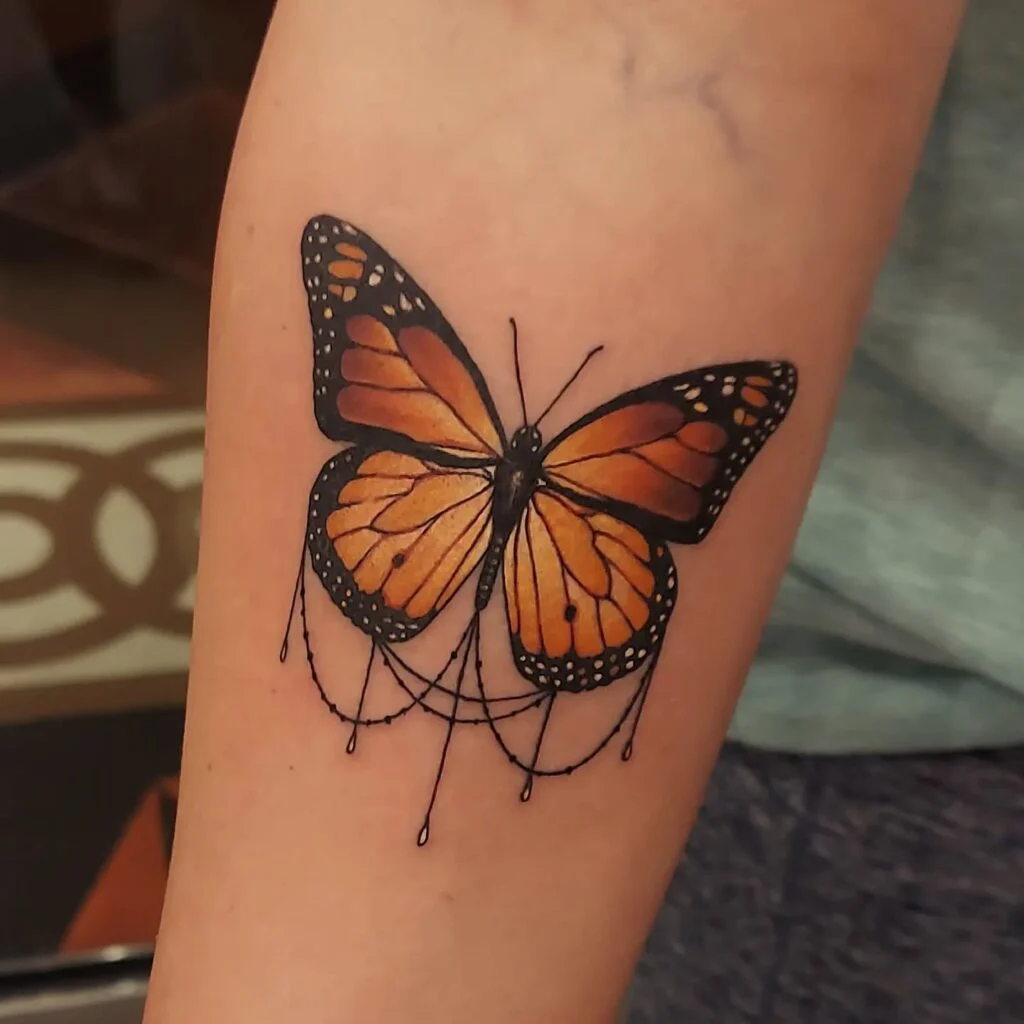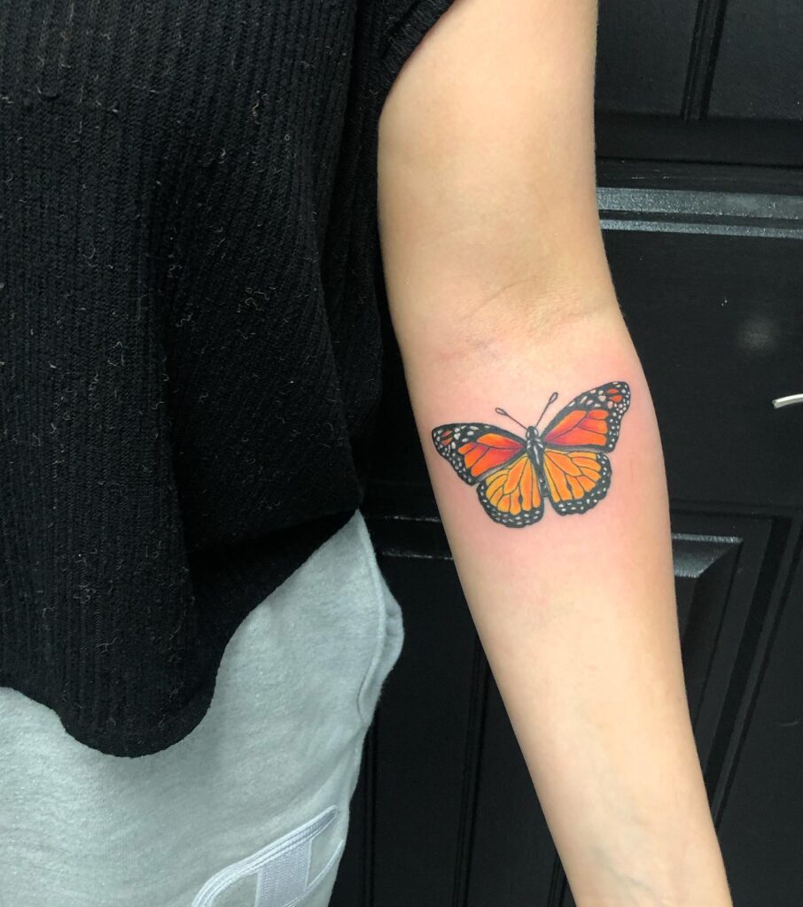 Its placement on the forearm ensures visibility, while the vibrant coloring makes it stand out from classic monarch designs. The detailed shading gives the butterfly depth, creating a lifelike yet artistic look.