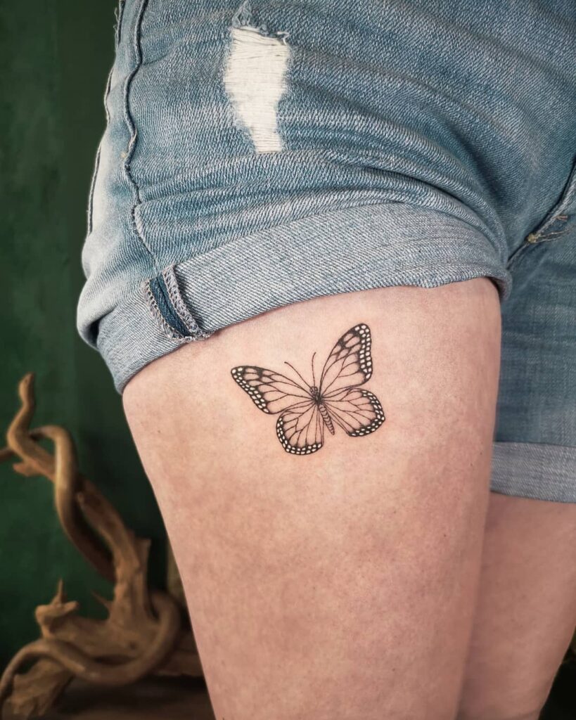 This tattoo features a fine line monarch butterfly placed on the upper thigh, designed with delicate black outlines.