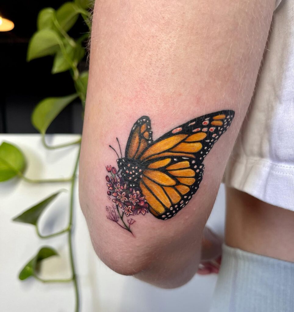 The milkweed blooms are inked in shades of pink and purple, adding texture and balance to the design. Placed near the elbow, the tattoo sits naturally with the arm’s curve, making the details more noticeable.