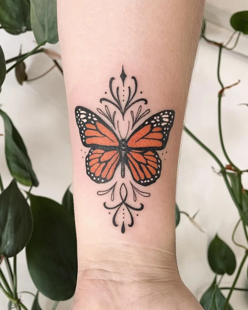 This tattoo combines the natural beauty of a monarch butterfly with elegant ornamental detailing.