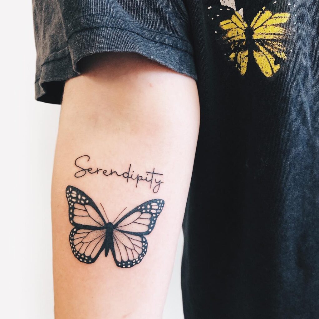This tattoo shows a bright monarch butterfly paired with the words written below in elegant script.