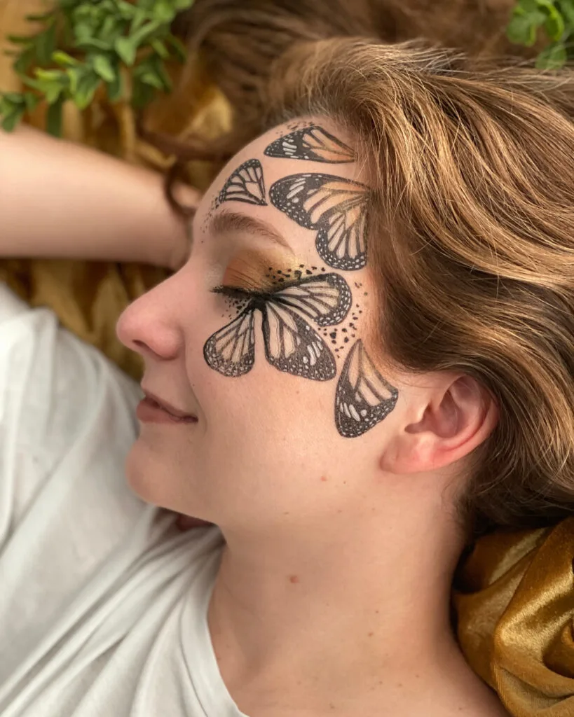 The overall layout feels artistic and expressive, turning the face into a living canvas decorated with monarch-inspired details.