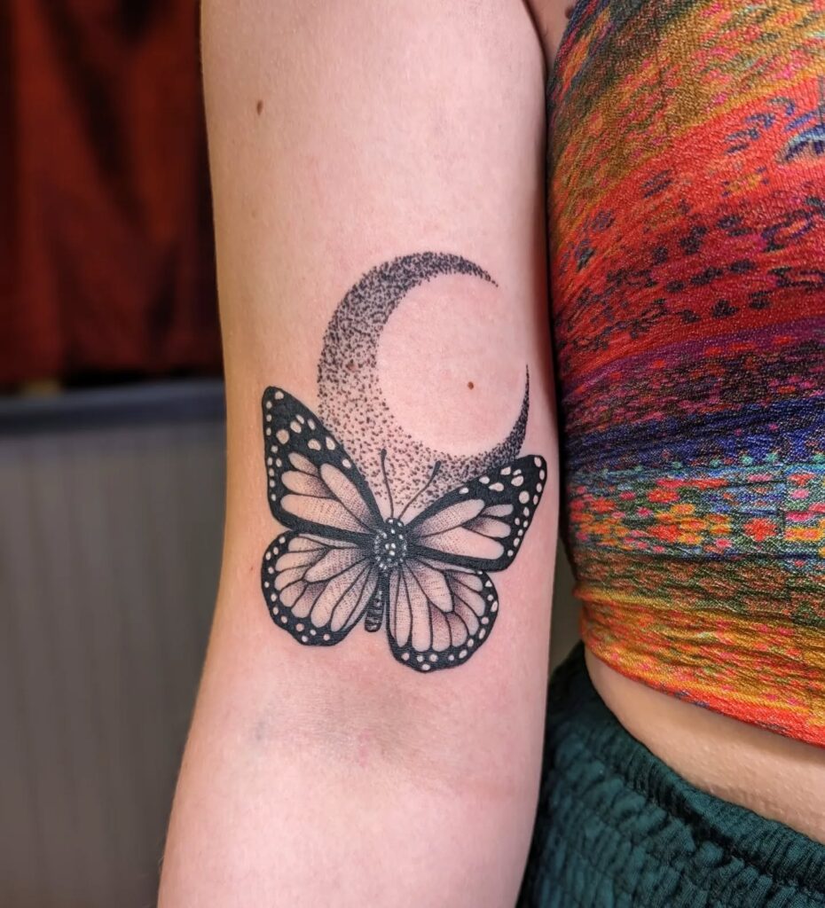 This tattoo beautifully combines a monarch butterfly with a crescent moon, creating a design full of symbolism and balance.