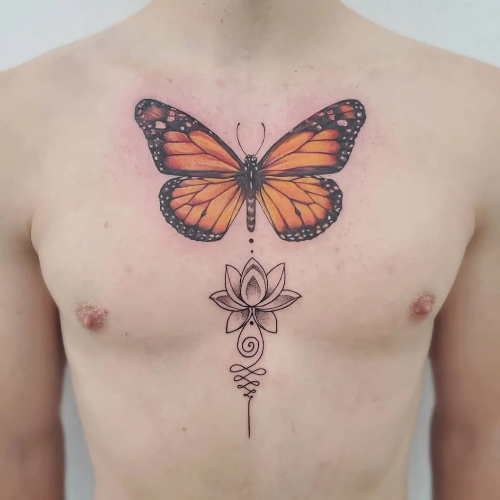 Monarch Butterfly and Lotus Chest Tattoo