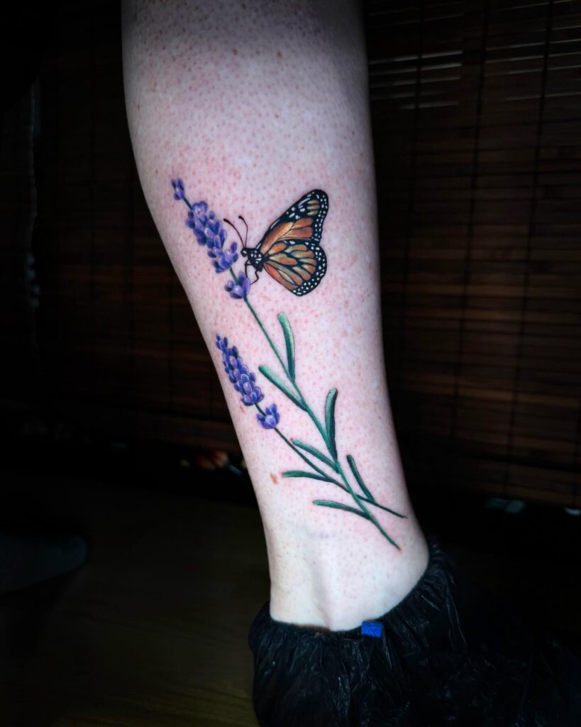 This tattoo beautifully combines a monarch butterfly with a lavender sprig, creating a calming and symbolic design.