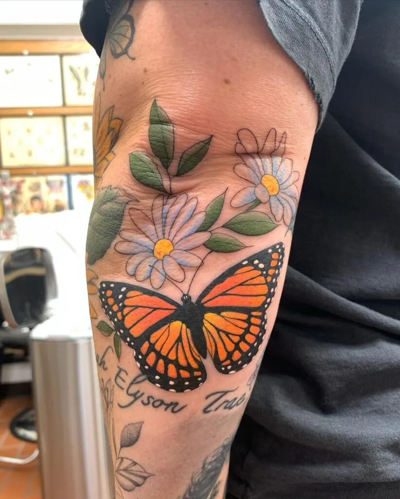 This tattoo features a finely detailed monarch butterfly positioned neatly above the elbow.