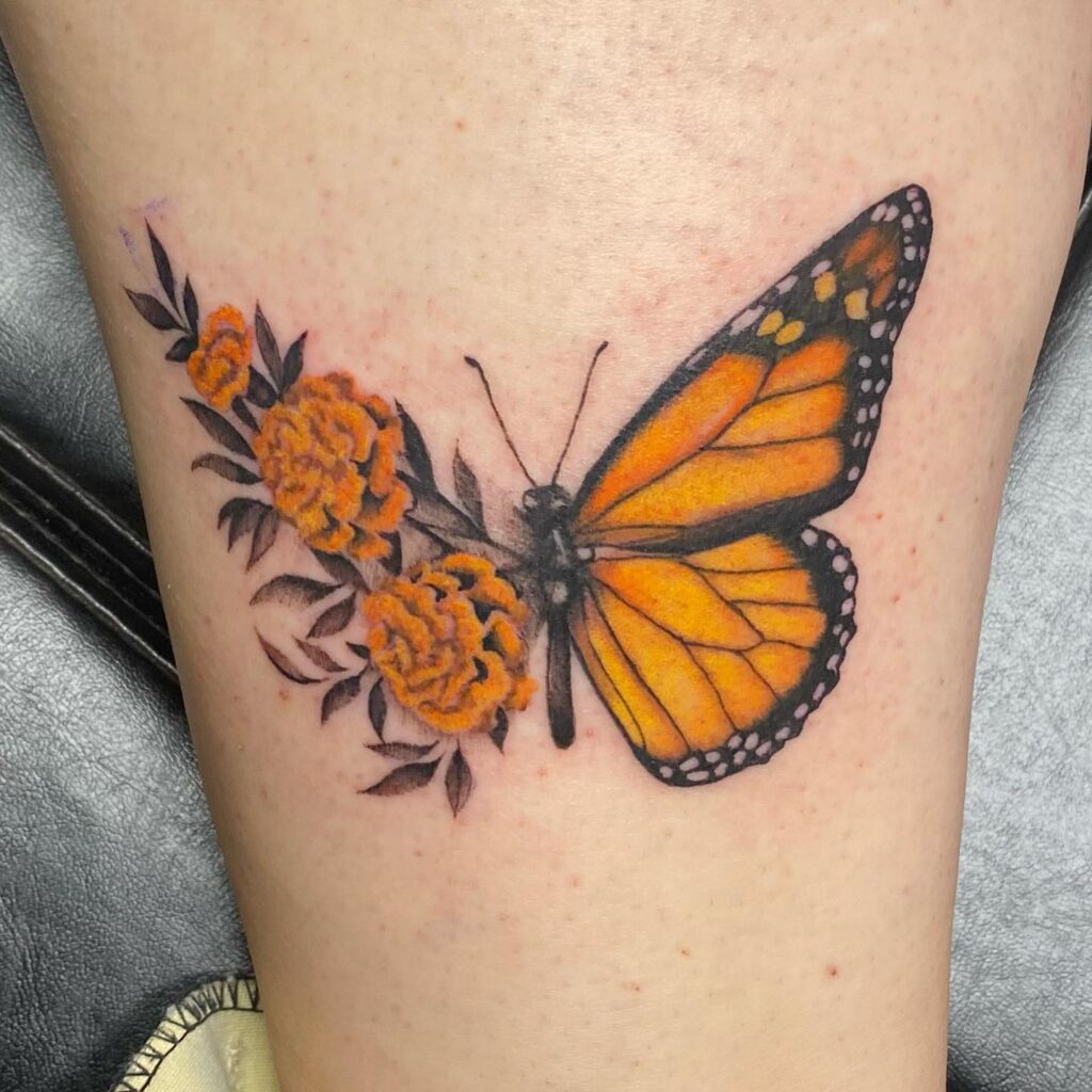 This tattoo beautifully combines a monarch butterfly with blooming marigold flowers, blending two powerful symbols of transformation and remembrance.