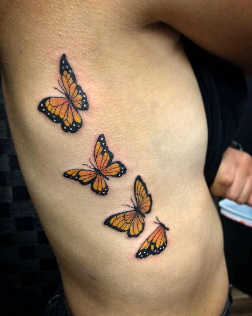 This rib tattoo showcases three vibrant monarch butterflies in flight, each carefully detailed with orange and black wings.