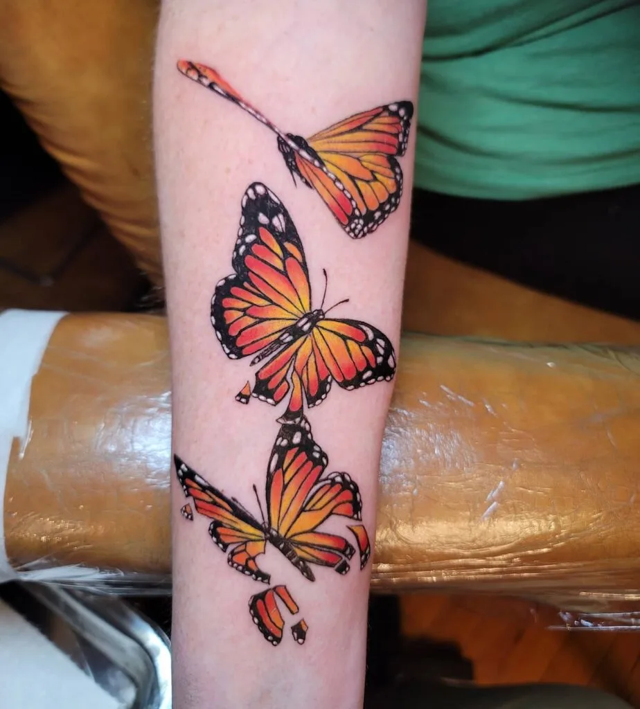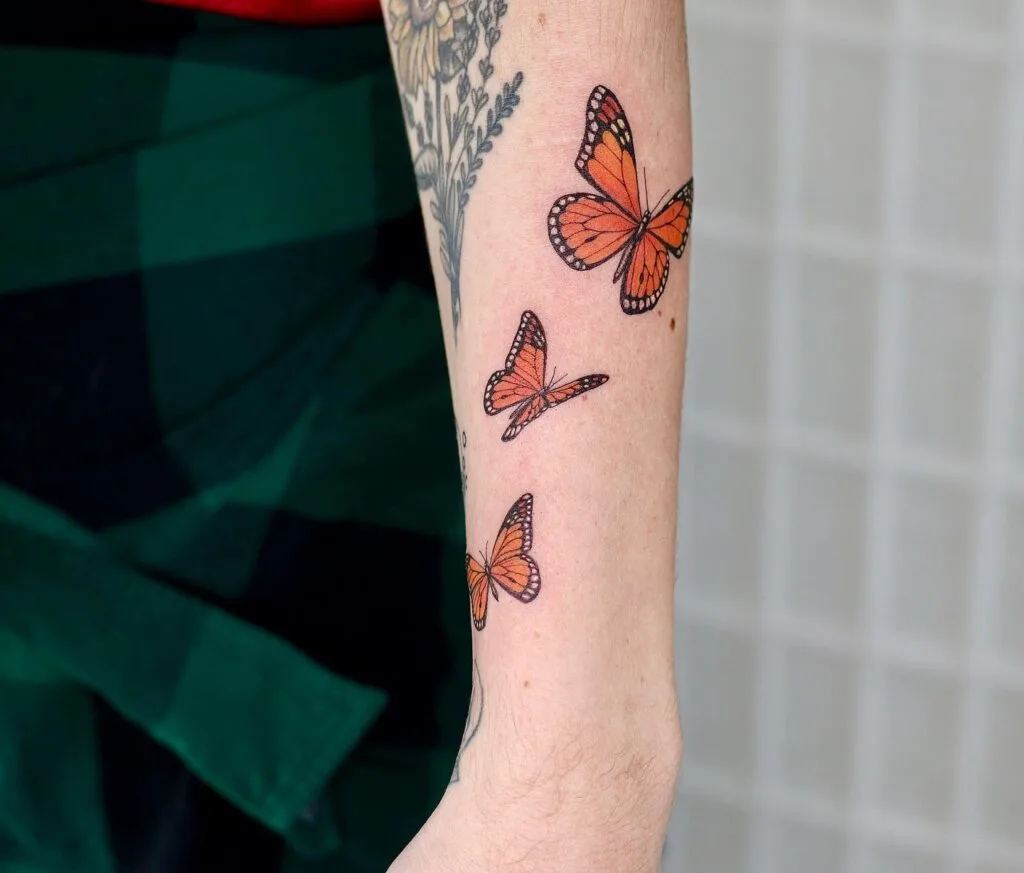 This tattoo features three monarch butterflies in different stages of motion, symbolizing growth and transformation.
