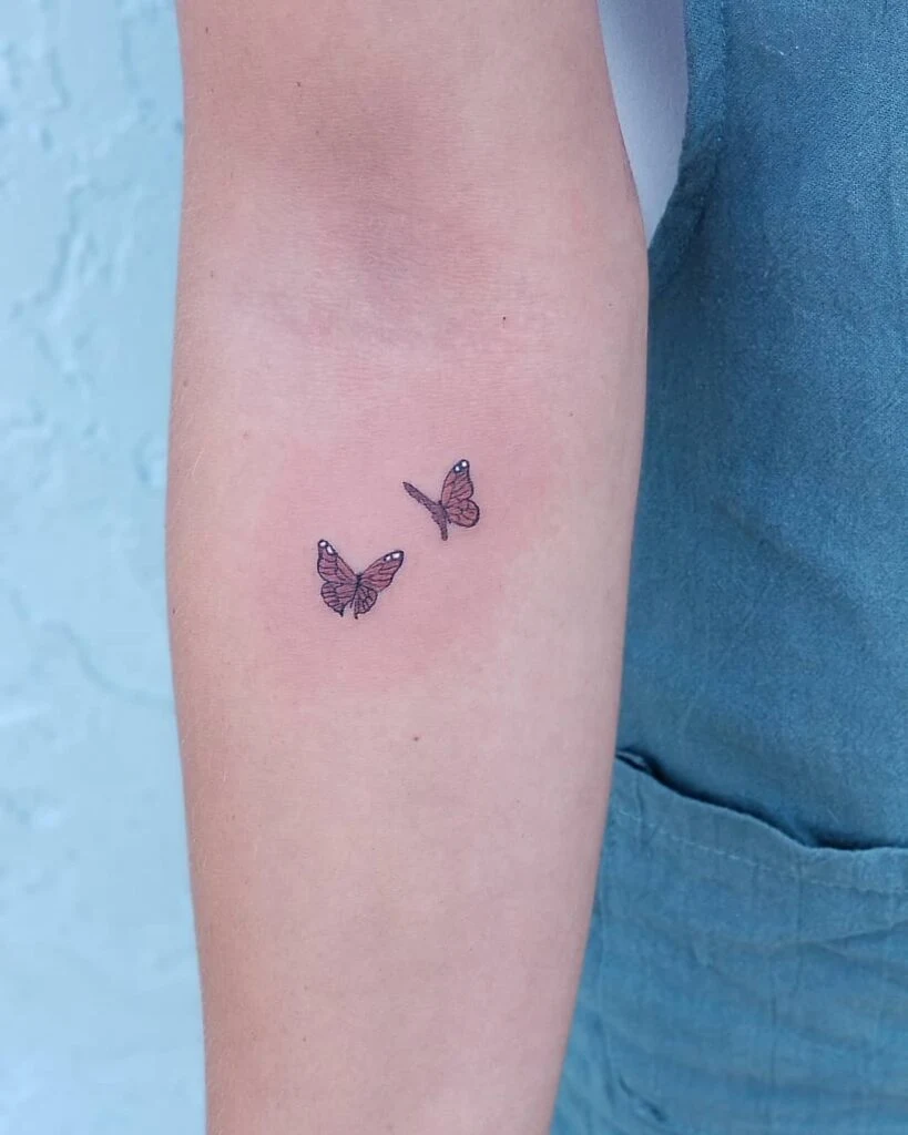 This tattoo design features two small monarch butterflies delicately placed on the inner forearm.
