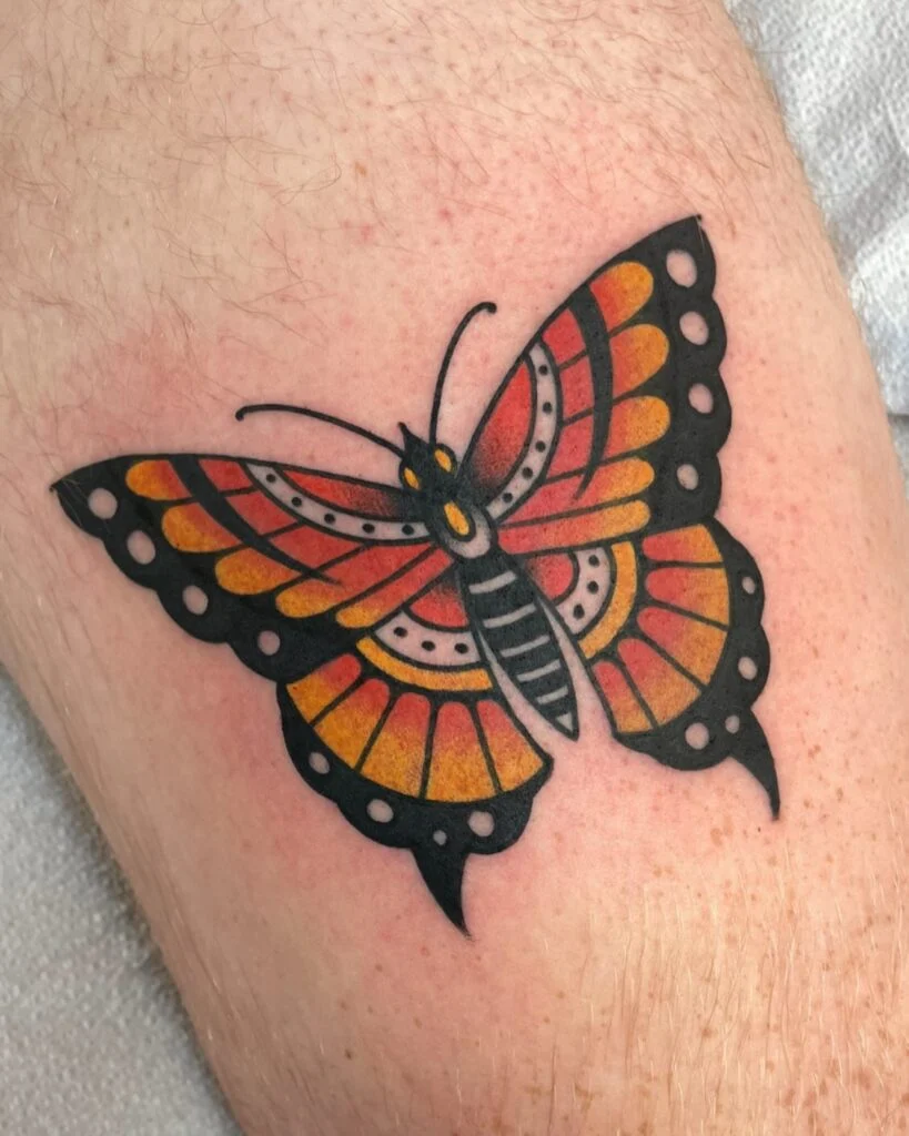 This approach combines timeless tattoo aesthetics with the butterfly’s natural beauty in a striking way.