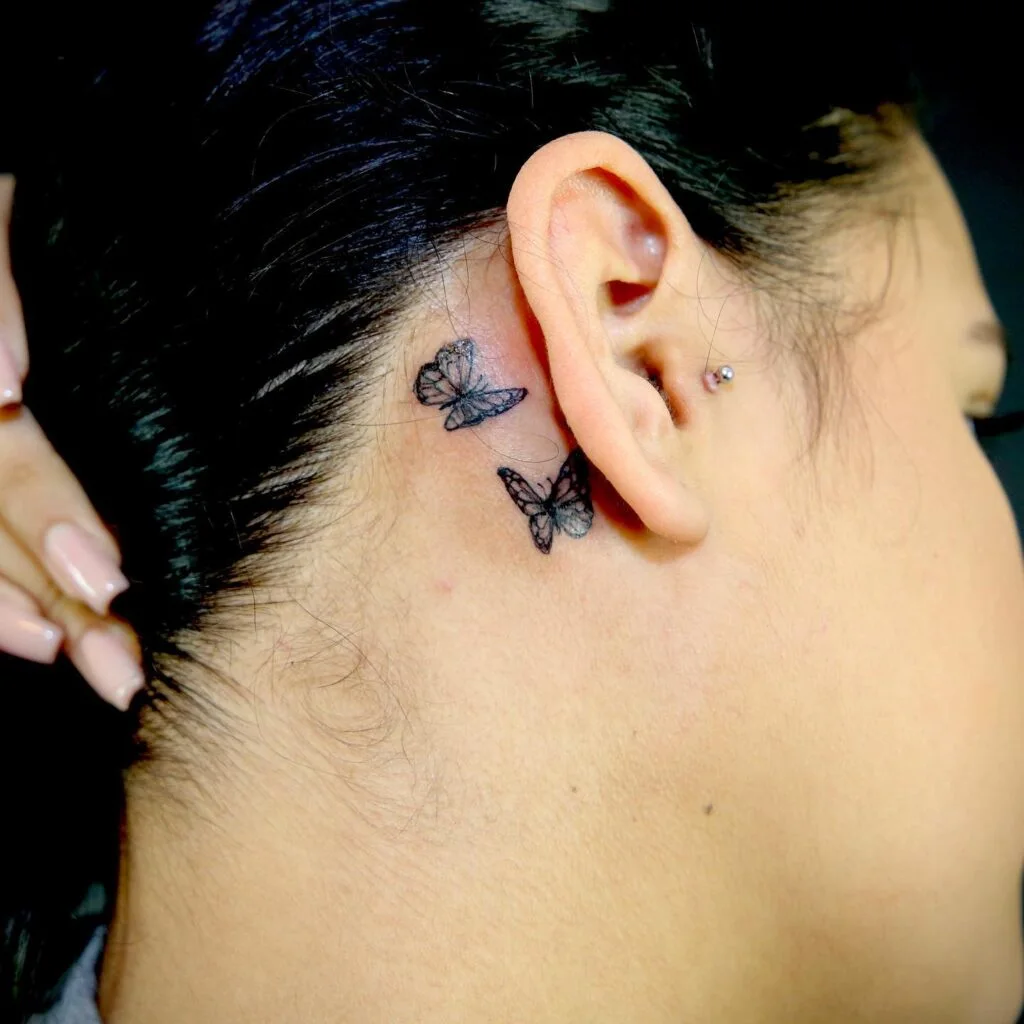 This tattoo features two small monarch butterflies placed delicately behind the ear.