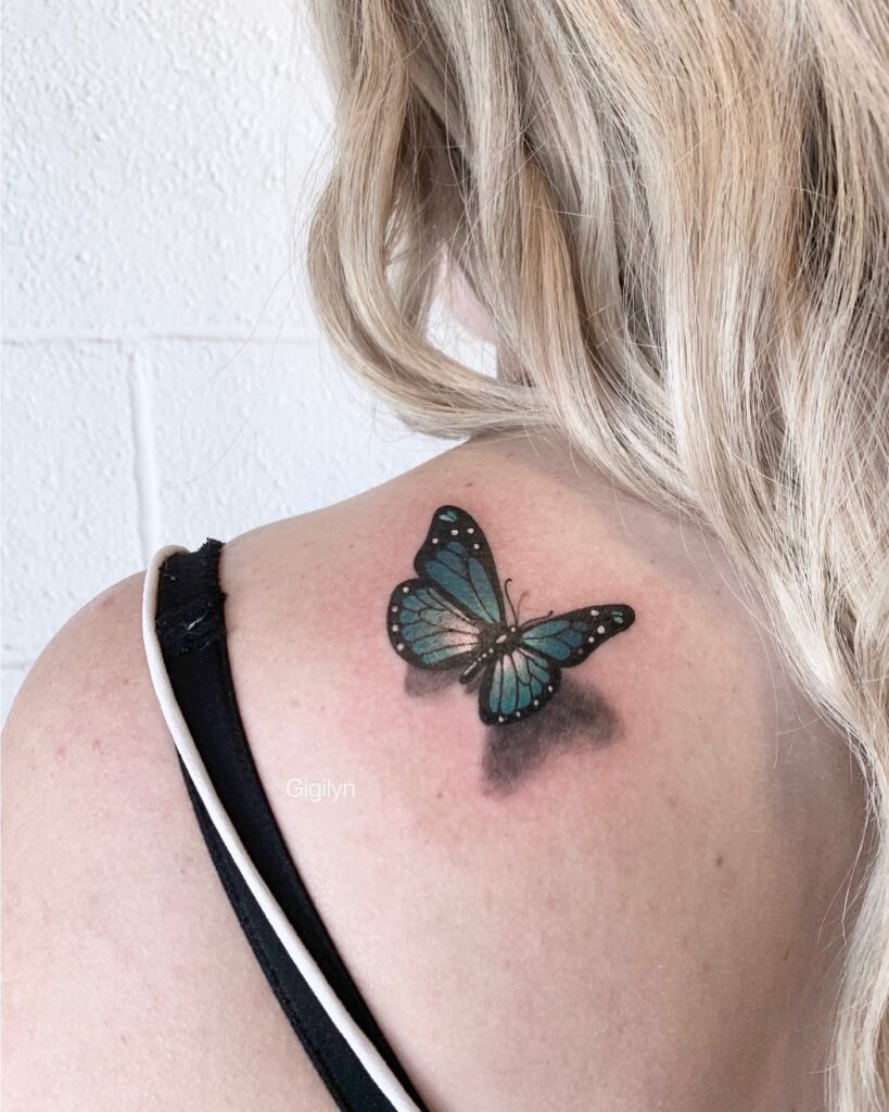 Positioned on the shoulder, this tattoo draws attention naturally, making it both elegant and bold. It’s a perfect design for someone who wants a realistic and visually captivating butterfly tattoo.