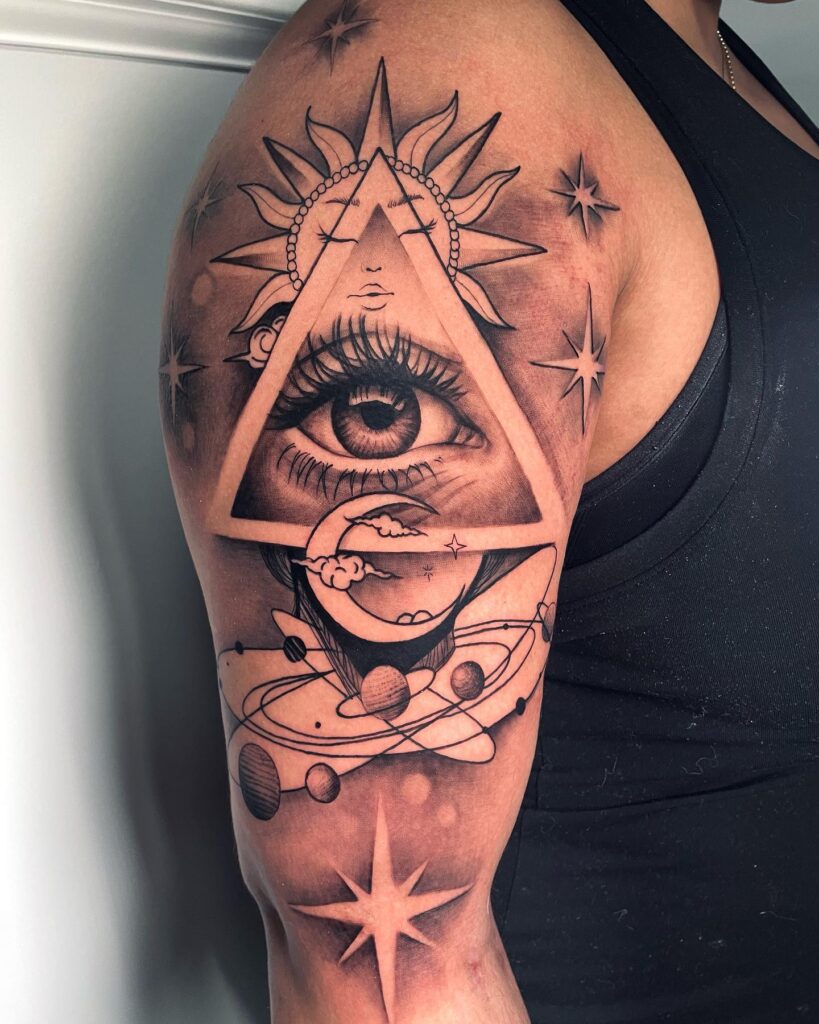 This tattoo combines cosmic and mystical elements, featuring an all-seeing eye within a triangle framed by celestial imagery.