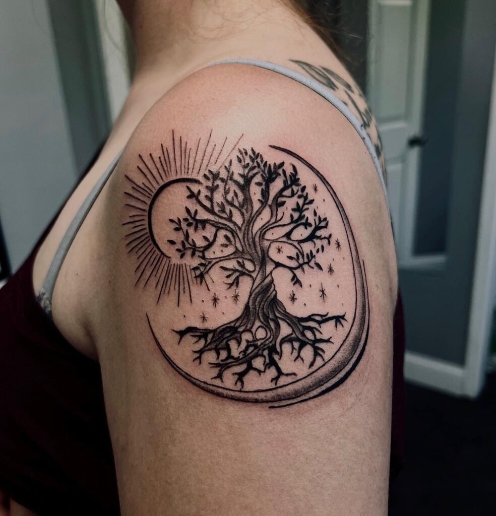 The balance of roots and branches emphasizes harmony between grounding and expansion. This mystical tattoo beautifully embodies life, wisdom, and interconnectedness, symbolizing both earthly stability and the infinite energy of the universe.