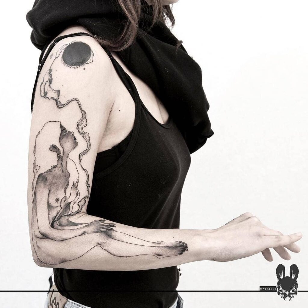 This tattoo portrays a seated female figure extending across the arm, her form blending seamlessly into flowing, dreamlike lines.