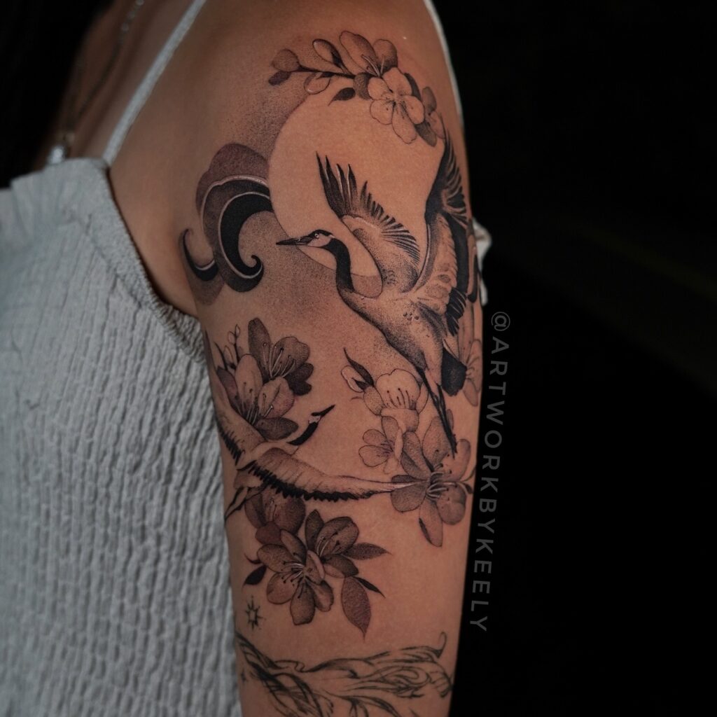 Their delicate, almost ghostly forms add a surreal quality. This tattoo symbolizes mindfulness, moral integrity, and the pursuit of spiritual clarity in a chaotic world.
