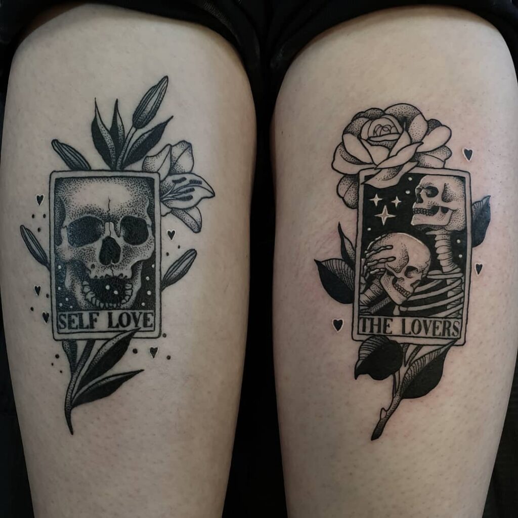 These striking tarot-inspired tattoos balance two powerful themes: self-acceptance and connection. The first design, marked “Self Love,” shows a skull framed with lilies, symbolizing purity, growth, and embracing inner strength.