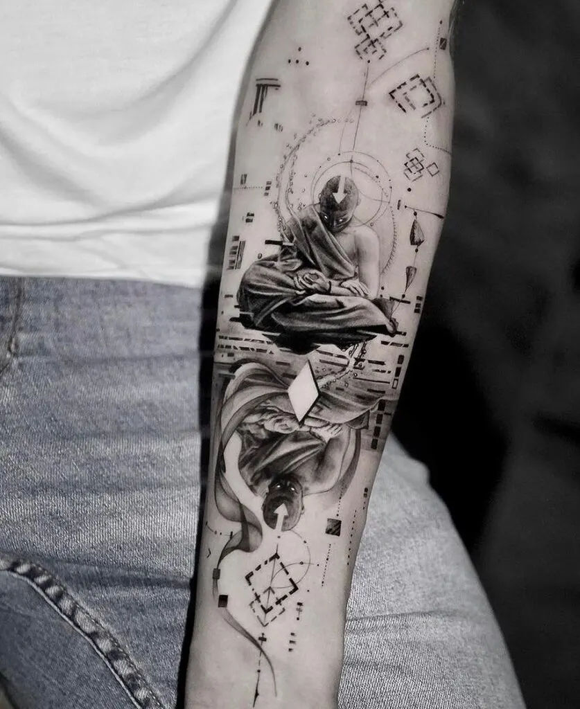 This tattoo portrays two mirrored monk-like figures, one upright and one inverted, symbolizing balance and duality. The upper figure sits in meditation, surrounded by geometric patterns and celestial circles, representing enlightenment and higher consciousness.