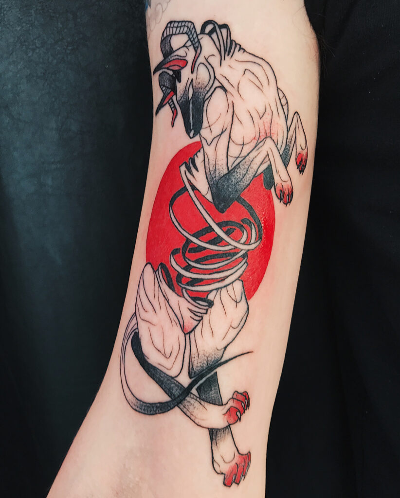This tattoo embodies chaotic energy, blending horror and fantasy into a bold, glowing statement of surreal mysticism.