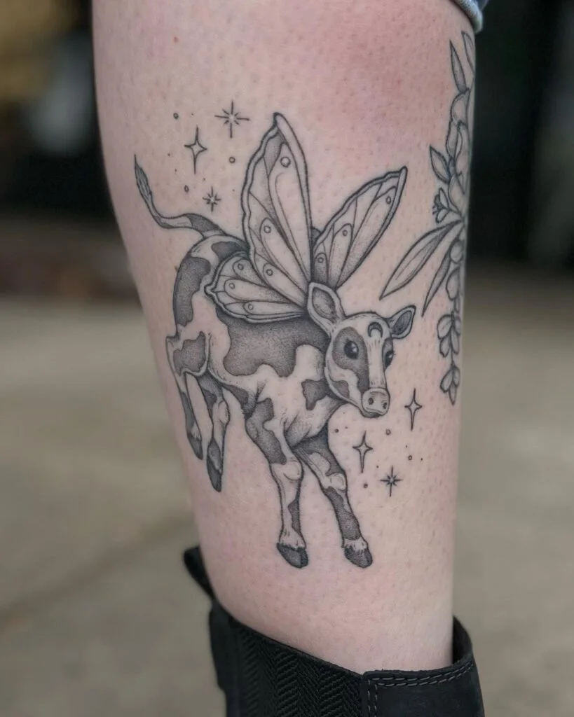 This charming tattoo features a small cow with delicate butterfly wings, blending innocence with enchanting fantasy. The cow’s gentle expression adds sweetness, while the intricately detailed wings suggest freedom and magical transformation.