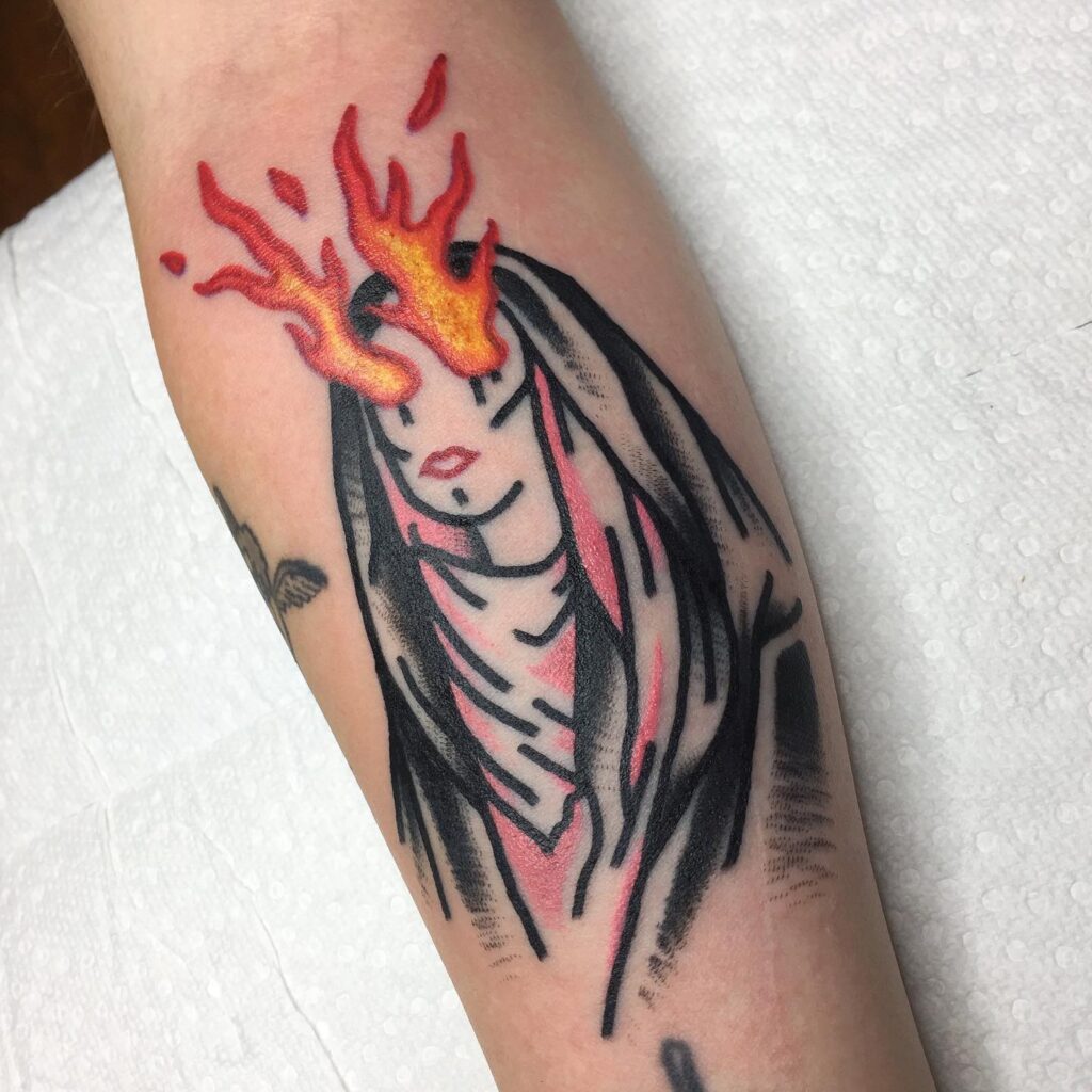 This striking tattoo depicts a robed woman with flames erupting from her eyes, creating a bold and mystical image. The fiery details glow in vibrant orange and red, symbolizing inner power, vision, and transformation.