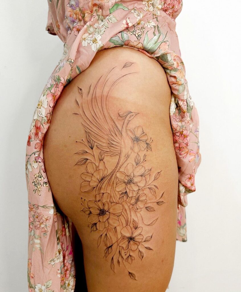 This tattoo illustrates a graceful phoenix rising elegantly among blooming flowers, blending themes of rebirth and natural beauty.