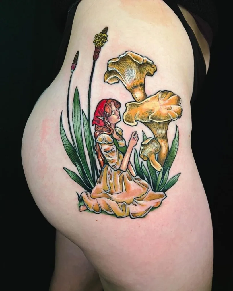 This mystical tattoo portrays a young maiden in a red headscarf and flowing dress, sitting peacefully among tall mushrooms.