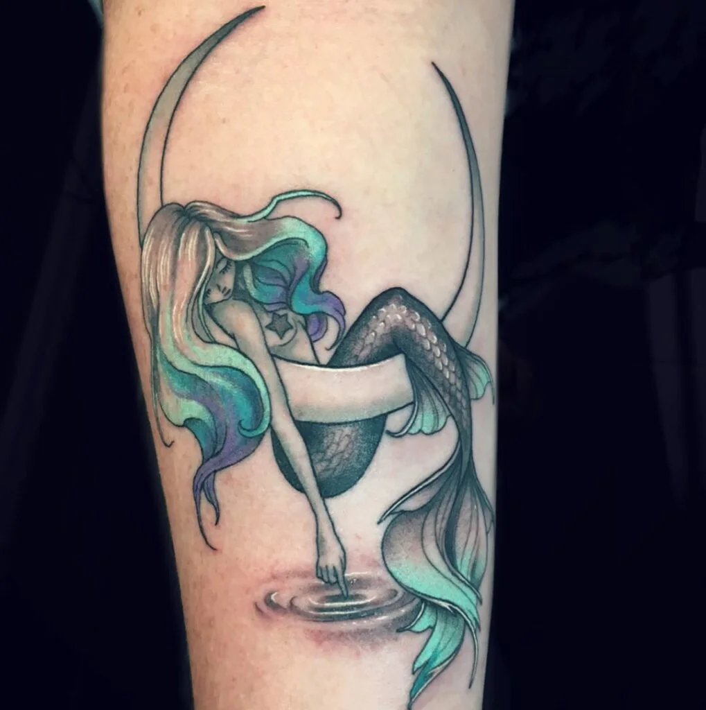 This tattoo illustrates a serene mermaid resting gracefully within a crescent moon, her hand gently touching rippling water. Her flowing hair, shaded in soft hues of turquoise, lavender, and teal, enhances the dreamy, mystical quality.