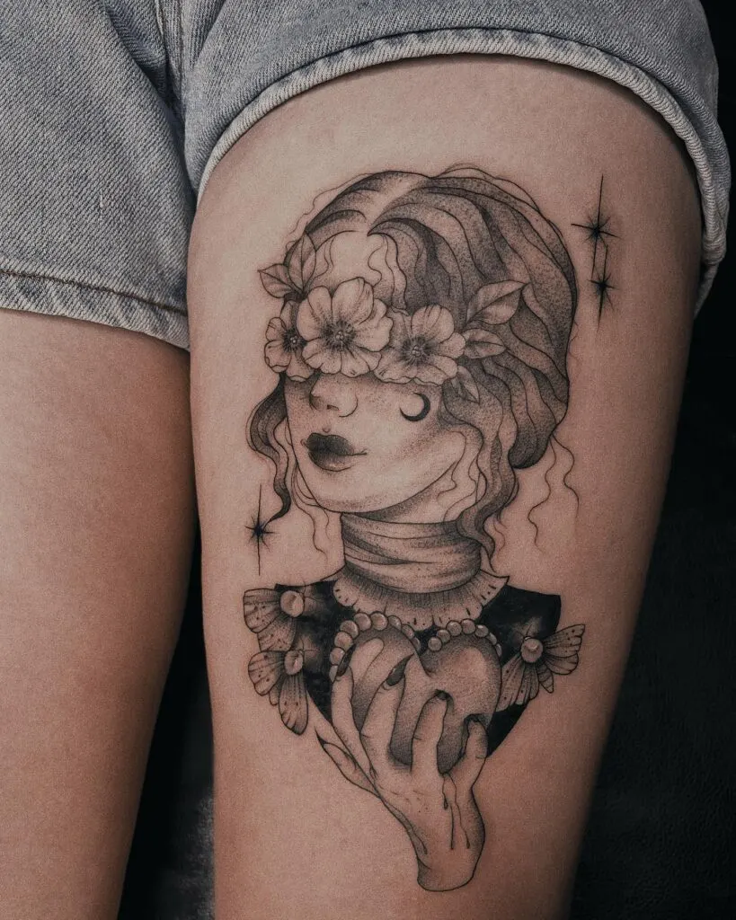 A small crescent moon rests delicately on her cheek, adding a touch of celestial magic to the design. She holds a heart cradled in her hands, surrounded by intricate ornamental details, representing devotion, vulnerability, and strength.