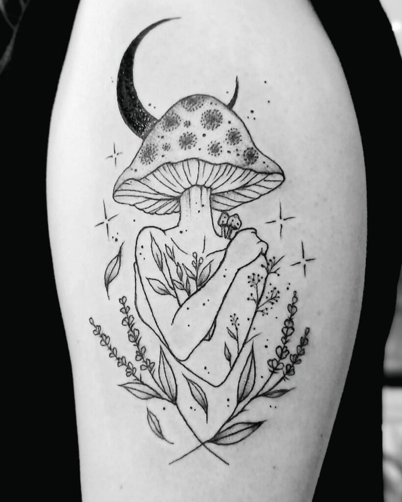 This tattoo portrays a humanoid figure with a mushroom cap for a head, merging nature and mysticism beautifully.