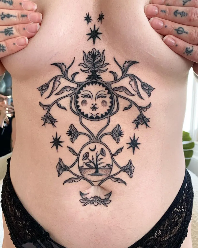 Mystical Sun and Moon Stomach Tattoo with Floral and Tree Motifs