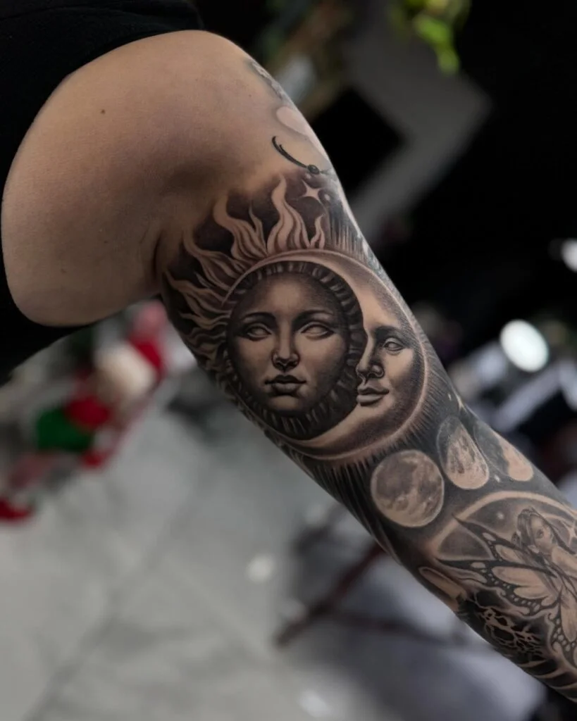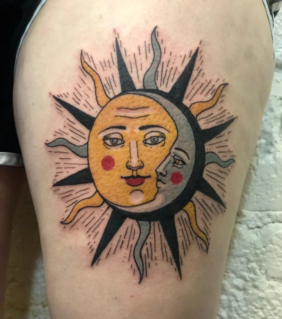 This tattoo portrays the sun and moon as human-like faces, positioned together to symbolize balance and duality.