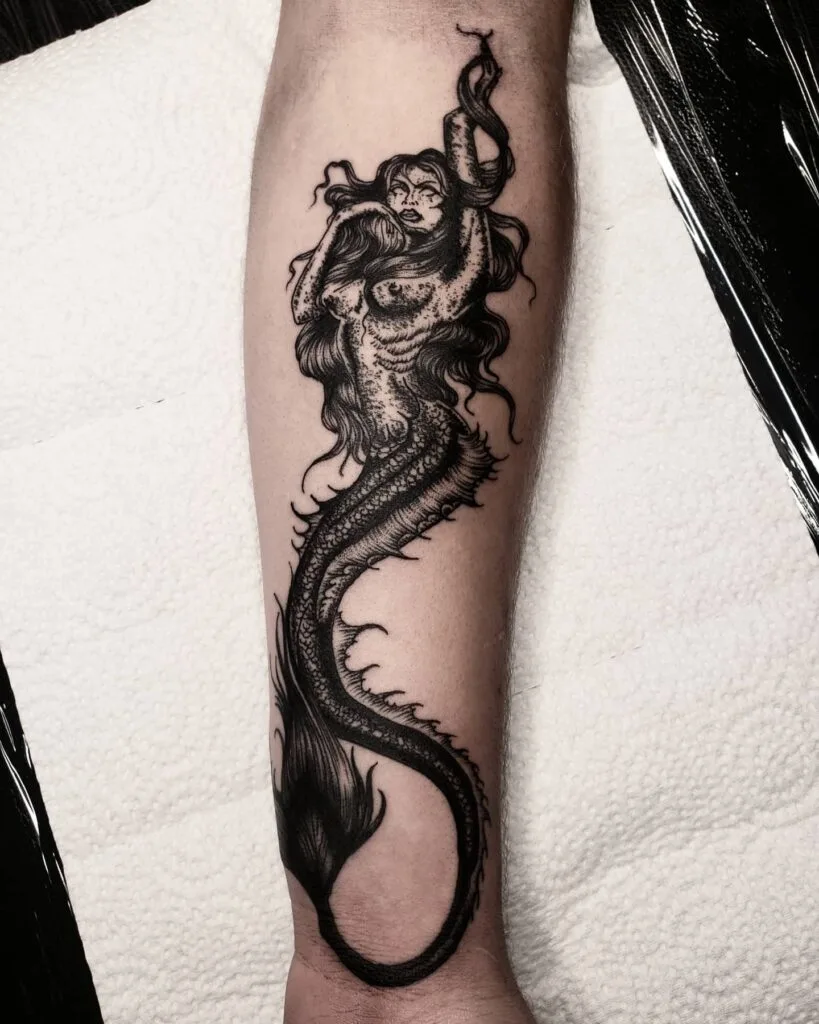 This tattoo portrays a haunting siren with a powerful presence, merging human beauty with a monstrous serpentine form.