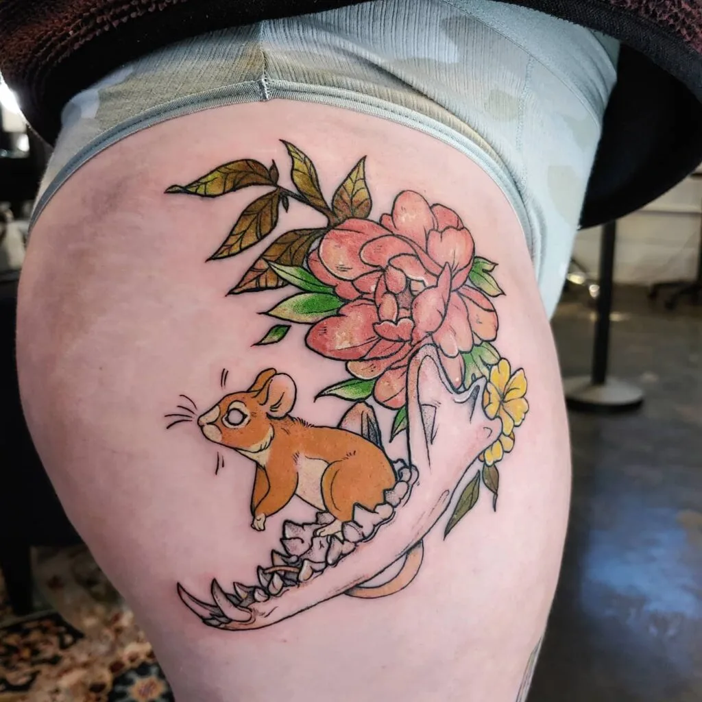 Mouse with Flowers and Jawbone Tattoo