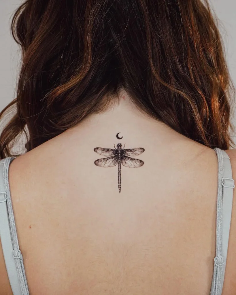 This tattoo shows a beautifully detailed dragonfly placed delicately on the upper back, symbolizing transformation and adaptability.