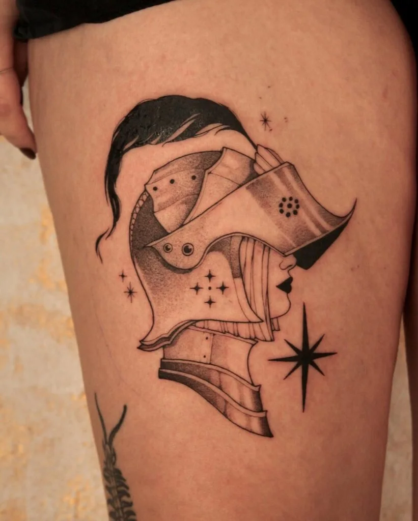This tattoo portrays a striking female knight in profile, her face partially hidden beneath a detailed medieval helmet. Flowing dark hair escapes from the helm, adding softness to the otherwise armored figure.