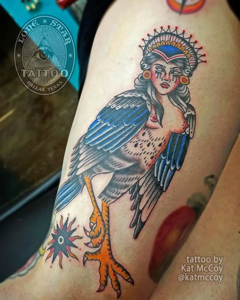 This tattoo portrays a harpy, a mythical creature with the body of a bird and the face of a woman. The design combines bright blues, fiery orange talons, and a striking crown-like headpiece, emphasizing both beauty and power.