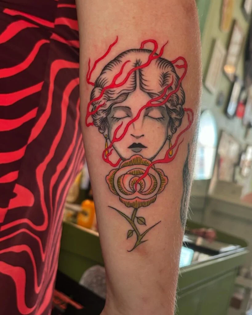 This tattoo beautifully blends femininity with warrior spirit, embodying courage, mystery, and the timeless balance between strength and grace.