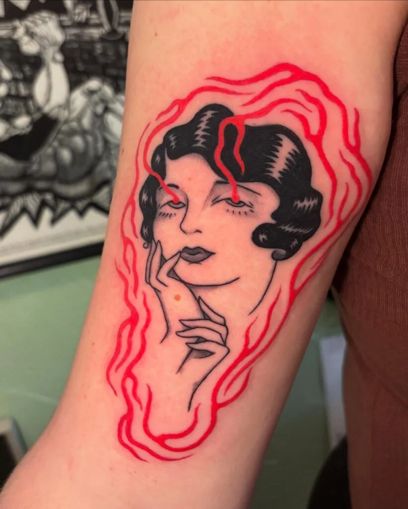This tattoo depicts a vintage-style woman framed by bold, flowing red flames, radiating mystical intensity.