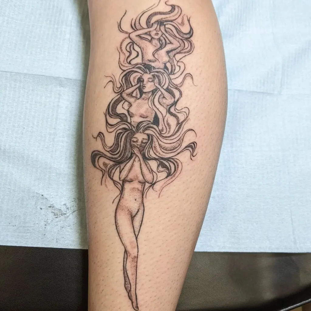This tattoo features three ethereal female figures stacked vertically, embodying the timeless concept of wisdom and morality. The top figure covers her eyes, symbolizing see no evil.