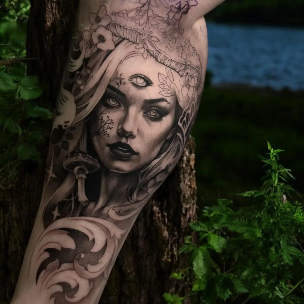 This tattoo depicts a mystical goddess-like woman with a third eye on her forehead, symbolizing heightened intuition and spiritual vision. Her crown of flowers and leaves connects her deeply to nature, enhancing her role as a guardian of the forest.