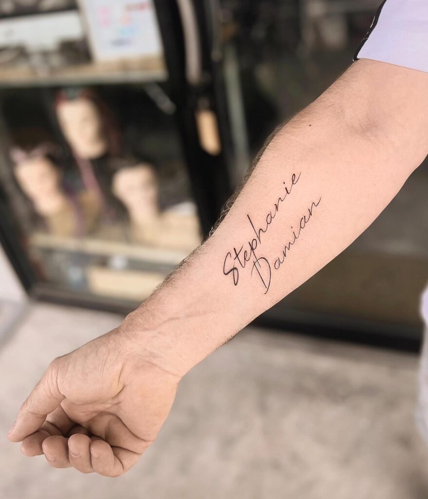 This tattoo features the names written in a delicate cursive script along the forearm. The clean, flowing lines of the names create an elegant and meaningful tribute to the wearer’s daughter and son.