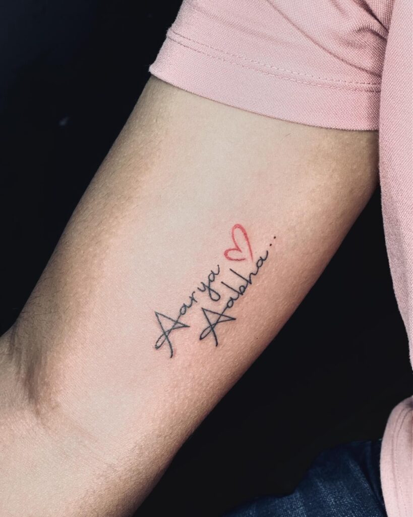 This tattoo features the namesin a delicate cursive script, symbolizing a close connection to two cherished individuals. A simple red heart adds a touch of warmth and love, beautifully complementing the understated design.