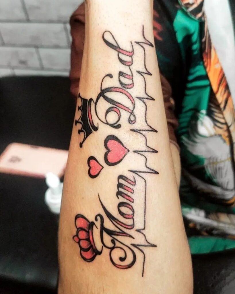 This tattoo features the words “Mom” and “Dad” written in elegant script, accompanied by two crowns, symbolizing them as king and queen figures in the wearer’s life. The design includes a heartbeat line running between the names, signifying the vital role parents play.