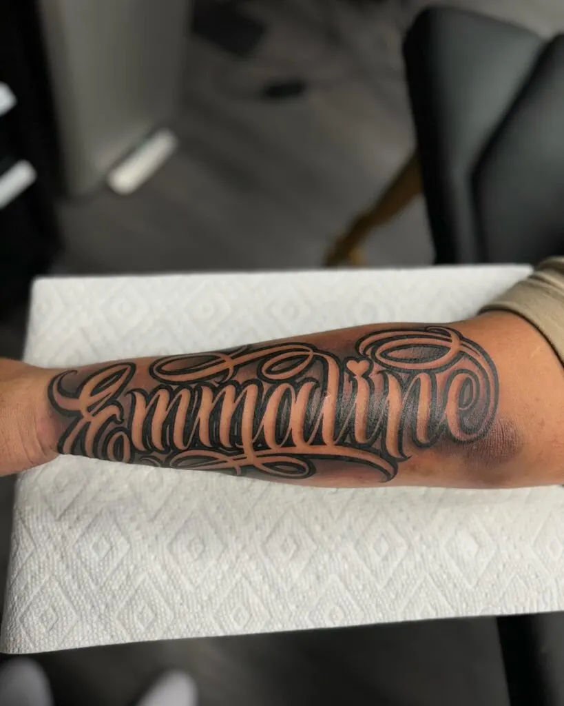 This tattoo features the name in a bold, sweeping script that spans the forearm. The thick black ink creates a striking contrast, with intricate loops and curves adding a sense of flow and artistry to the design.