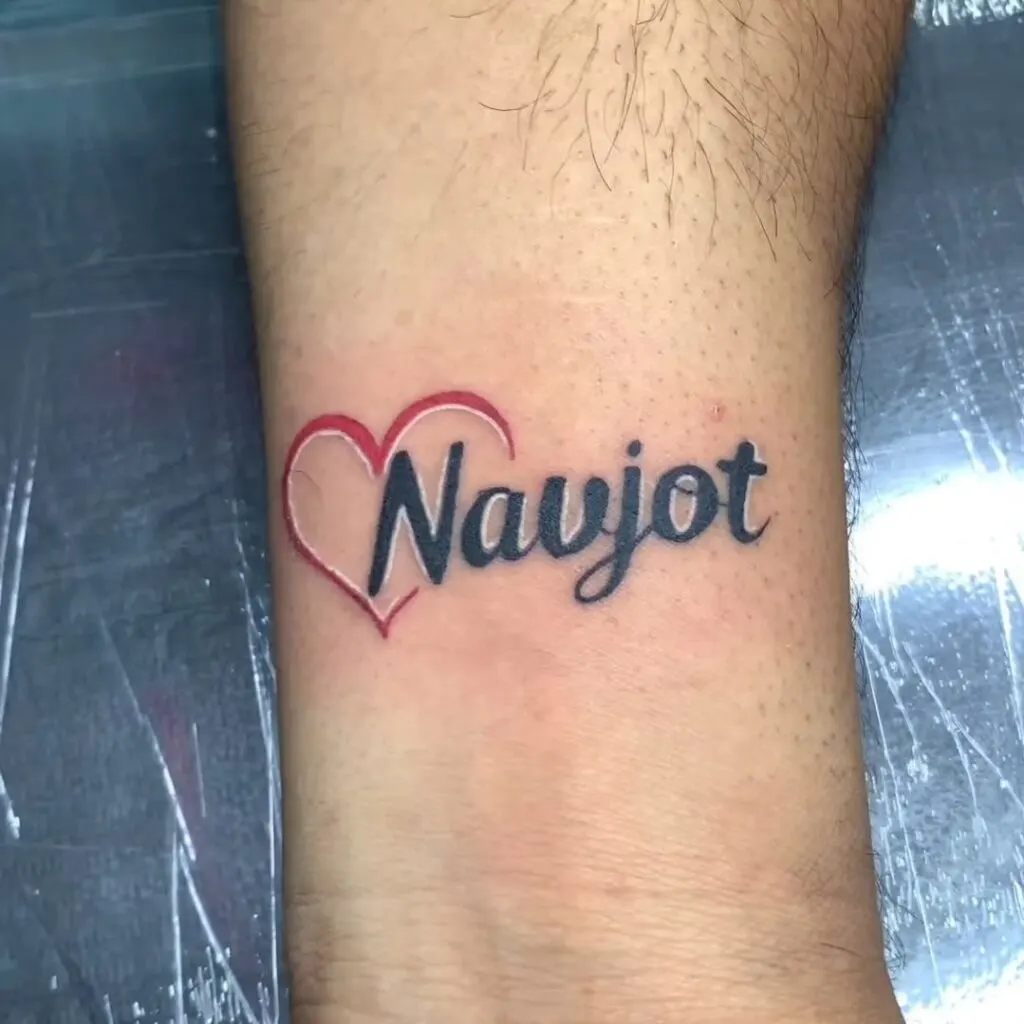 This tattoo features the name in bold, black script, with a red heart outline that elegantly wraps around the first letter. The minimalistic design is clean and straightforward, making it a perfect choice for those who want to express their affection with simplicity.