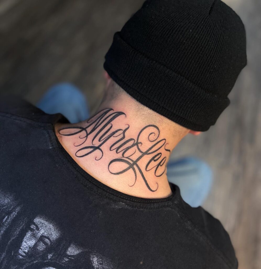 This tattoo beautifully displays the name in an elegant, flowing script on the back of the neck. The sweeping curves and stylish lettering give the design a sophisticated touch while making a bold statement.