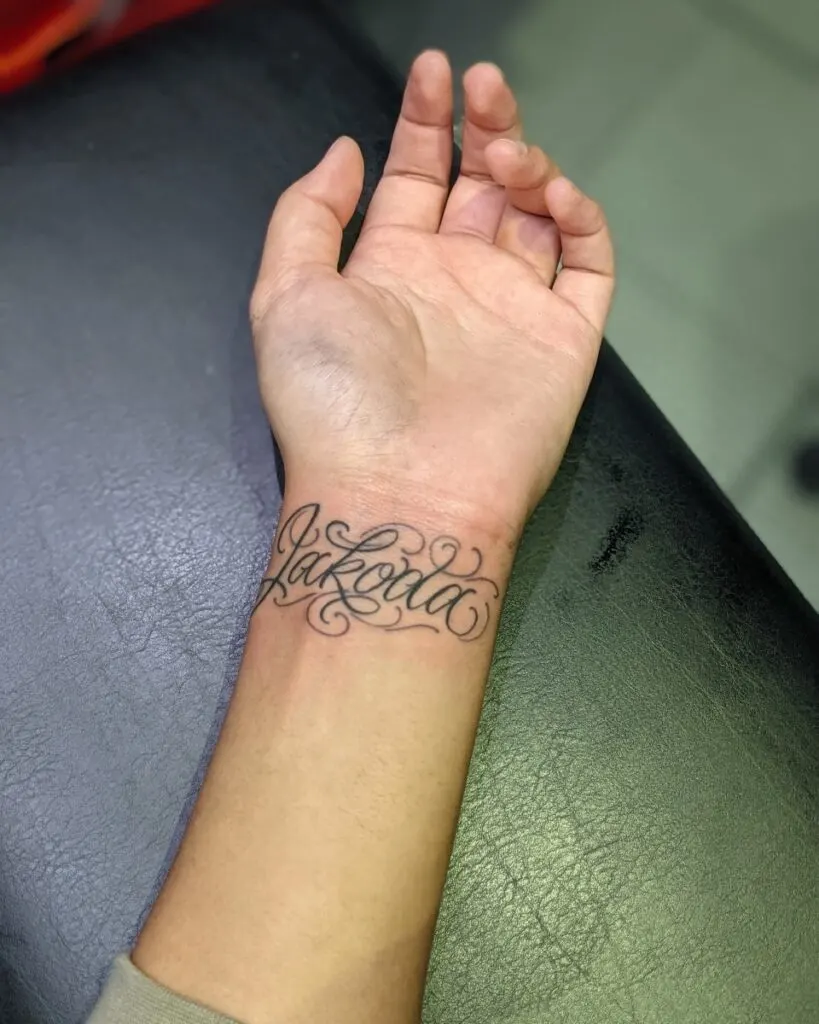 This tattoo displays the name in a flowing, ornate script on the wrist. The delicate swirls and curves surrounding the letters add an artistic and personal touch to the design. Positioned on the wrist, it serves as a constant reminder of someone significant, keeping their name close at hand.